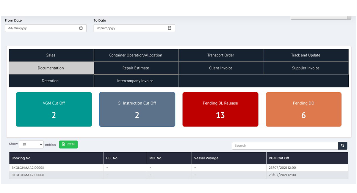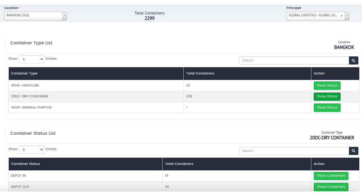 Envanter panelleri, tüm bölgelerdeki mevcut konteynerlerin önceden planlanmasını ve rezervasyonlar için tahsis edilmesini sağlar. Sistem ayrıca kiralık, COC, SOC konteynerler ve diğer tüm principal konteynerleri tek bir platformda yönetir.